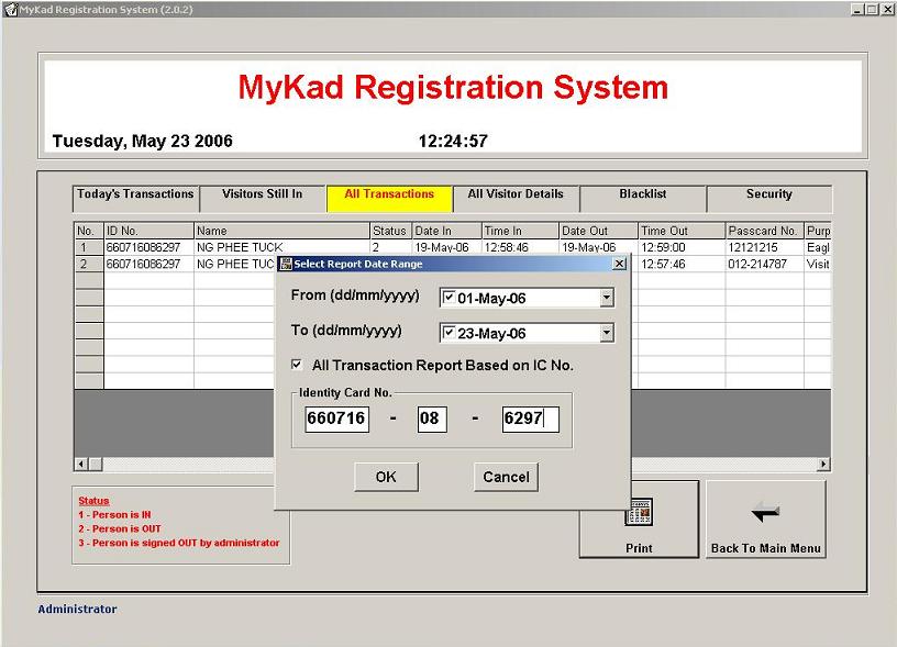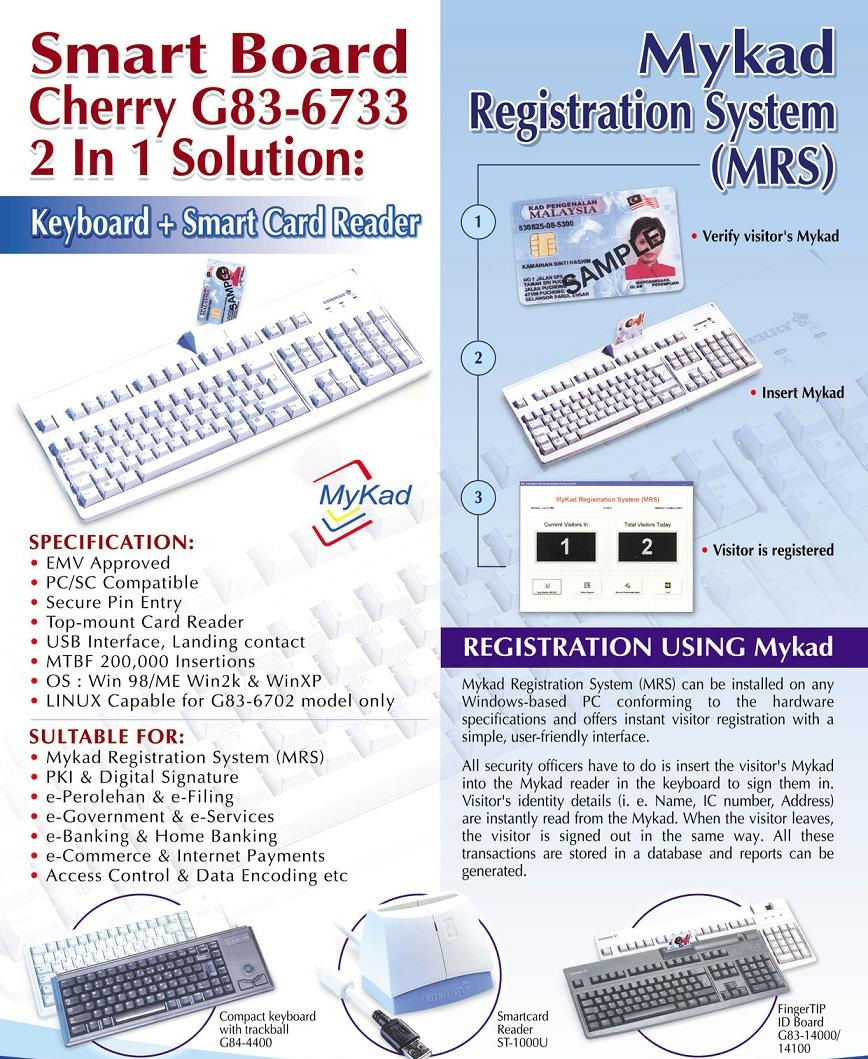 MyKad Registration System (MRS) comes with a simple, user-friendly interface. All security officers have to do is insert the visitor's MyKad into the MyKad reader in the keyboard to sign them in. Visitor's identity details (i.e. Name, IC number, Address) are instantly read from the MyKad. When visitor leaves, the visitor is signed out in the same way.